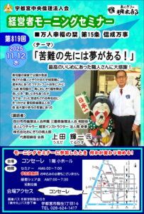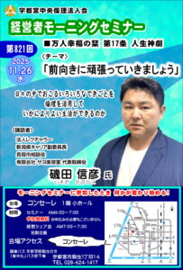 2024年6月5日(水) 第746回 講師:鶴川 宗弘 2024 4/25 セミナー 2024年5月8日 セミナー 【令和6年度 第2回女性セミナー】5月22日(水) 【6月】モーニングセミナーのご案内 関連記事 2025年11月26日(水) 第821回 講師:磯田 信彦 2025年10月27日 2025年11月19日(水) 第820回 講師:高木 和博 2025年10月27日 2025年11月12日(水) 第819回 講師:上田 輝一 2025年10月27日 2025年11月5日(水) 第818回 講師:太田 みか子 2025年10月27日 2025年10月22日(水) 第816回 講師:伊藤 一嘉 2025年9月30日 2025年10月15日(水) 第815回 講師:塩田 敏之 2025年9月30日 2025年10月8日(水) 第814回 講師:五十嵐 薫 2025年9月30日 2025年10月1日(水) 第813回 講師:金田 光央 2025年9月30日