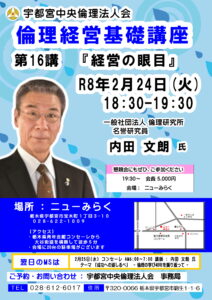 2024年7月24日(水) 15周年記念パーティー 2024 6/13 宇都宮中央倫理法人会 2024年6月13日 宇都宮中央倫理法人会 2024年6月15日(土) 朝礼発表会開催のお知らせ 2024年6月25日(火) 経営者イブニングセミナー 関連記事 2026年2月24日(火) 倫理経営基礎講座 2026年1月26日 【元気な朝礼】モーニングセミナーの流れ 2026年1月19日 【2月】モーニングセミナーのご案内 2026年1月19日 【元気な朝礼】モーニングセミナーの流れ 2025年12月27日 【1月】モーニングセミナーのご案内 2025年12月27日 【12月】モーニングセミナーのご案内 2025年12月4日 【元気な朝礼】年末年始のお知らせ 2025年12月4日 【経営者の集い『事業継承と倫理経営』】11月25日(火) 2025年10月27日